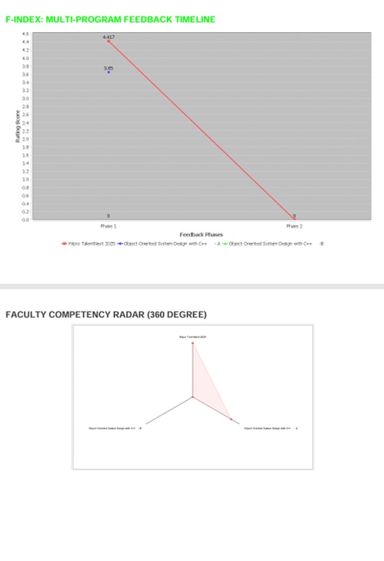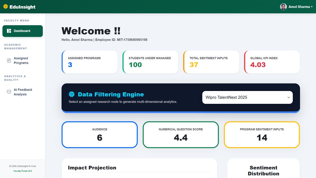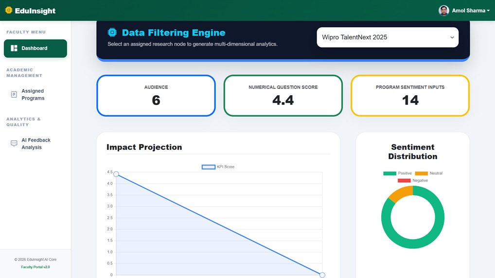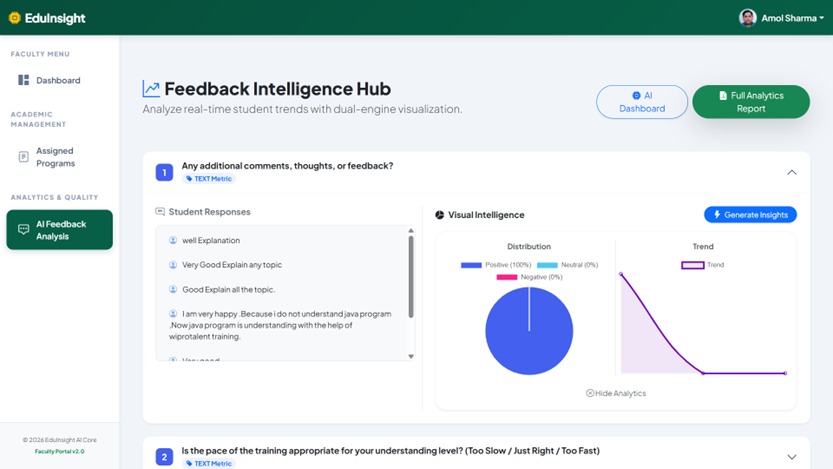 The EduInsight system was assessed based on real student feedback gathered during a live academic training program, involving 6 students, 1 professor, and 1 Head of Department (HOD). The system effectively handled both quantitative ratings and qualitative text feedback.