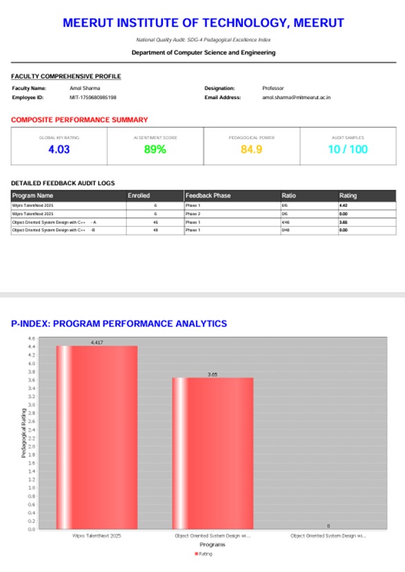 Through Sentiment Analysis, Text Summarization, and Key-Phrase Extraction, the system assesses student feedback to produce a KPI Rating, Sentiment Position (%), and Pedagogical Power Index (PPI) for objective insights supporting SDG 4 (Quality Education).
