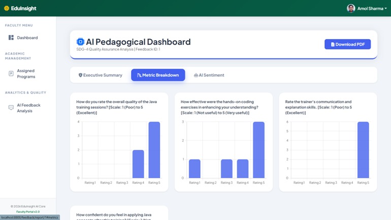 - ●Interactive dashboards and downloadable PDF reports provide clear, practical, and data-driven insights to educators.